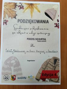 W ostatnich dniach października br. w naszej szkole odbyła się akcja charytatywna Banku Żywności w Lesznie pod nazwą "Podziel się kurtką, czapką i szalikiem". Osoby zainteresowane mogły podzielić się dobrą kurtką, nie noszonym szalikiem, czy niemodną, ale dobrą czapką. Odzież została...